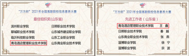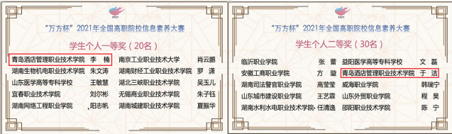 本网讯(教育信息中心 翟小乐)12月12日,“万方杯”2021年全国高职院校信息素养大赛落下帷幕。我院信息工程技术学院2020级计算机应用技术D01班李楠荣获个人一等奖和答辩表现三等奖,2020级数字媒体应用技术01班于洁荣获个人二等奖,图书馆荣获国赛最佳组织奖,教育信息中心王鑫荣获先进工作者称号。