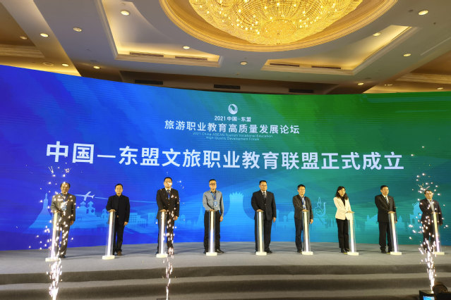 活动中,我院、中国-东盟职业教育研究中心、北海职业学院、泰国宋卡王子大学等国内外11所院校、单位联合发起成立中国-东盟文旅职业教育联盟,宋超与联合发起单位领导共同启动联盟成立按钮,并与现场嘉宾就深化文旅职业教育合作进行交流。在主旨演讲环节,文旅学院院长石媚山以《构建1+1+N国际合作新模式 打造服务旅游产业高质量发展的“青酒样本”》为题分享了学院旅游职业教育国际化的思考与经验。