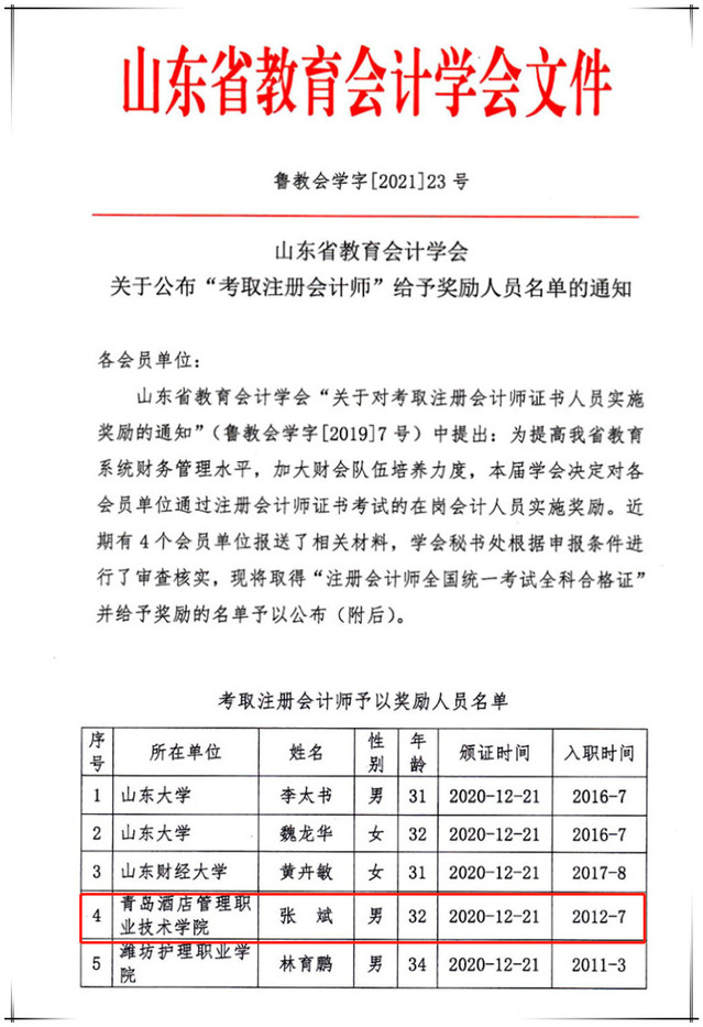 本网讯(财务处 于昆)近日,山东省教育会计学会公布了“考取注册会计师”给予奖励人员名单,学院财务处张斌老师荣获山东省教育会计学会奖励。