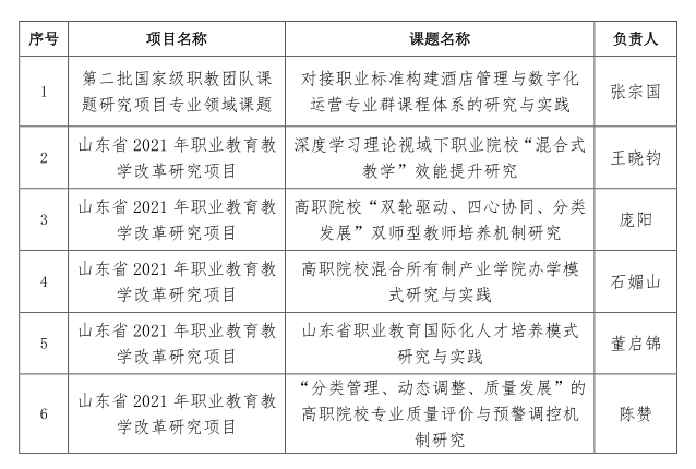 本网讯(教务处 张坦)近日,根据教育部和山东省教育厅公布结果,我院成功立项1项第二批国家级职教团队课题研究项目和5项山东省2021年职业教育教学改革研究项目。具体立项情况如下: