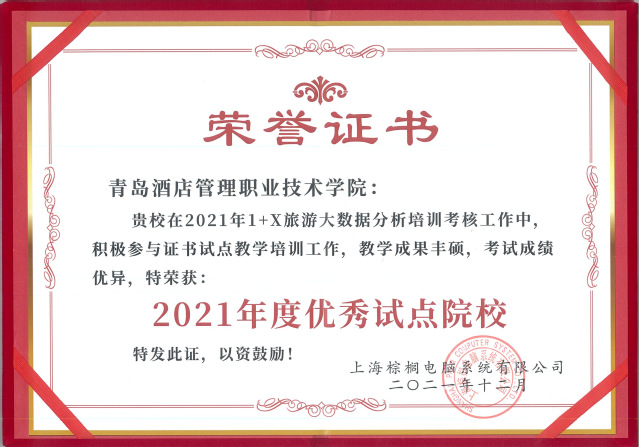 基于调研编制旅游管理专业群人才培养方案,建立“底层共享、中层分立、高层互选”的专业群课程体系,将1+X旅游大数据统计分析技能等级标准证书与专业课程进行对接和融合,培养学生的数字化能力,提升学生的数字化素养。组织74名专业学生参加教育部1+X大数据统计分析技能等级标准证书试点,全部通过考试。3月6日,在试点总结会上,学院被评为2021年度优秀试点院校。