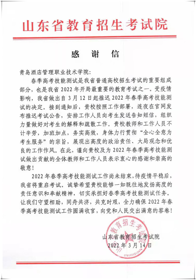 本网讯(教务处 庞阳)近日,山东省教育招生考试院向taptap发来感谢信,对taptap高质量落实山东省关于推迟2022年春季高考技能测试工作的统一部署、步调一致应对疫情的有关工作表示感谢。