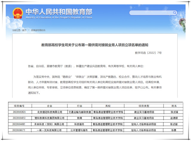 为落实党中央、国务院“稳就业”“保就业”决策部署,深化产教融合、校企合作,推动人才培养与就业有机联动、人才供需有效对接,教育部高校学生司组织有关用人单位和高校实施了供需对接就业育人项目。经高校申请、用人单位申报、专家审核、立项单位信息核查,确定了第一期供需对接就业育人项目名单。