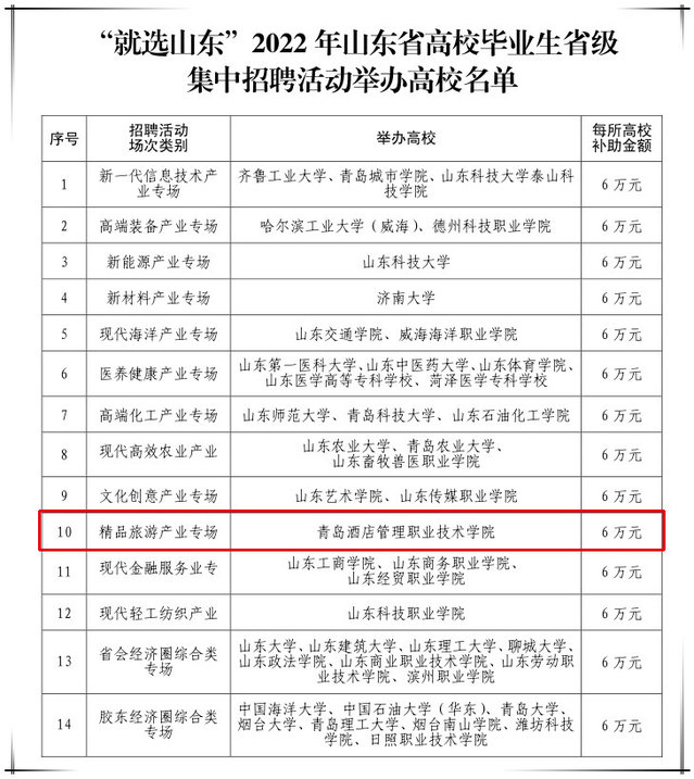 本网讯(招生就业办公室 刘卿文)近日,山东省人力资源和社会保障厅发布了“就选山东”2022年山东省高校毕业生校园招聘系列活动通知,taptap入选2022年省级集中招聘活动举办高校,也是举办“精品旅游产业专场”的唯一院校,并获得补助资金6万元。
