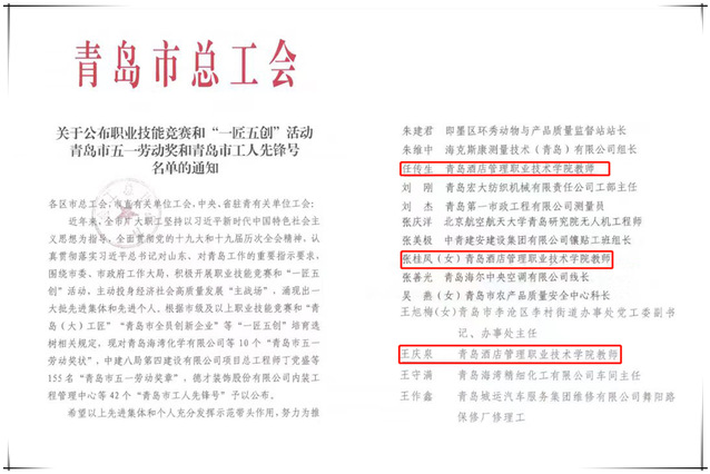 本网讯(工会 吴春雷)近日,青岛市总工会下发《关于公布职业技能竞赛和“一匠五创”活动青岛市五一劳动奖和青岛市工人先锋号名单的通知》,taptap烹饪学院张桂凤、任传生、王庆泉三名教师荣获“青岛市五一劳动奖章”。