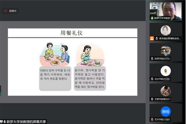 该项目由韩国新罗大学教授吴起涛主讲。吴起涛以日常生活、饮食习惯、学习模式、专业设置等模块为切入点,带领同学们通过“云端”走进韩国新罗大学,感受不同院校的学习和生活。在交流互动环节,吴起涛对学生的积极提问给予了详细解答。