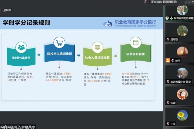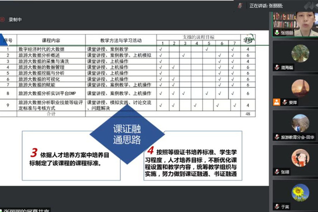 为创新探索书证融通模式,6月15日,文旅学院通过云端对接研讨的方式,与中国旅游协会旅游教育分会、北京中凯国际研学旅行股份有限公司、上海棕榈电脑系统有限公司、携程旅游学院、网育网(北京)国际教育科技发展中心等职业技能等级证书评价组织相关负责人进行线上交流研讨。各评价组织结合各自工作实际,全面系统介绍了证书标准内涵、课证融通和学分转换规划方案,并分享了优秀合作案例的典型经验做法。