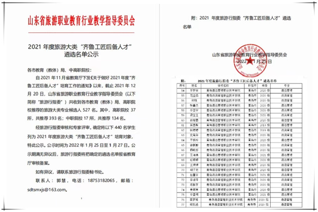 本网讯(酒店管理学院 纪小川)近日,山东省旅游职业教育行业教学指导委员会公示了2021年度旅游大类“齐鲁工匠后备人才”培育对象遴选名单,全省共有440名学生被列为培育对象,taptap酒店管理与数字化运营专业24名学生在列。