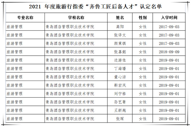 前期,文旅学院根据通知要求,认真组织开展了相关遴选、审核及报送工作。在培育阶段,文旅学院配备了专门的工匠导师和业务精湛的教师,为培育对象提供个性化指导,并加强培育全过程给质量监控。推荐的25名学生全部入选2021年度旅游大类“齐鲁工匠后备人才”培育对象遴选名单。经旅游行指委审核,旅游管理专业边游佳等12名学生入选“齐鲁工匠后备人才”认定名单。