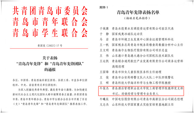 本网讯(工商管理学院 孙毅)近日,共青团青岛市委下发了《关于表扬“青岛青年先锋”和“青岛青年先锋团队”的通报》,工商管理学院青年教师牛俊杰获评“青岛青年先锋”。