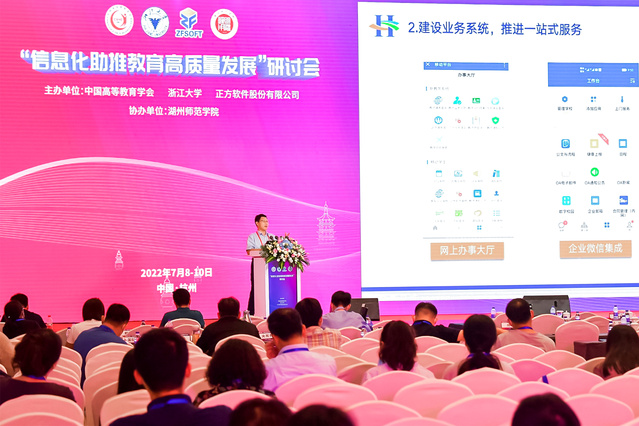 本网讯(教育信息中心 王风磊)7月9日-10日,由中国高等教育学会、浙江大学联合正方软件股份有限公司共同主办,湖州师范学院协办的“信息化助推教育高质量发展”研讨会在浙江杭州举行。学校副院长张宗国参加会议并作主题报告。