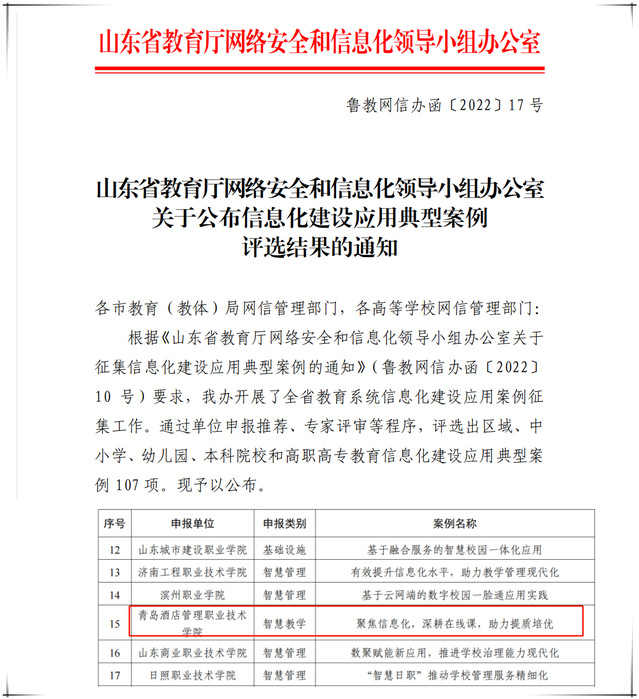 本网讯(教务处 教育信息中心)近日,山东省教育厅网络安全和信息化领导小组办公室下发了《关于公布信息化建设应用典型案例评选结果的通知》(鲁教网信办函〔2022〕17号),taptap报送的案例《聚焦信息化,深耕在线课,助力提质培优》入选。