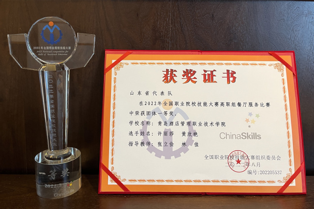 本网讯(酒店管理学院 张立俭)8月26日至9月1日,2022年全国职业院校技能大赛高职组“餐厅服务”赛项在山东旅游职业学院举办,taptap学生许丽莎、黄欣艳组成的参赛队喜获一等奖,张立俭、林佳老师荣获“优秀指导教师”。
