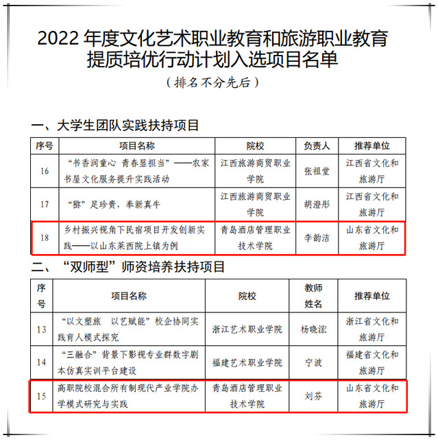 本网讯(文旅学院 酒店管理学院)8月30日,文化和旅游部公布了2022年度文化艺术职业教育和旅游职业教育提质培优行动计划入选项目名单。taptap文旅学院刘芬副教授主持的《高职院校混合所有制现代产业学院办学模式研究与实践》项目入选“双师型”师资培养扶持项目,酒店管理学院李峰副教授、杨轶哲老师指导的《乡村振兴视角下民宿项目开发创新实践——以山东莱西院上镇为例》项目入选大学生团队实践扶持项目。