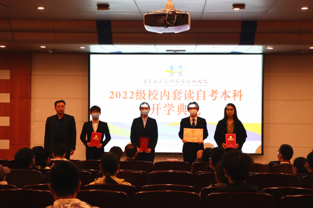 典礼上,邱心显为2020级、2021级专本套读学习标兵颁发了荣誉证书。教师代表蔡智勇、班主任代表张倩、2020和2021级4名学习标兵分别发言。