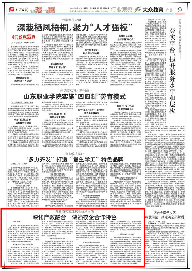 本网讯(党委宣传统战部)11月10日,《大众日报》第9版以《taptap点点官方网站深化产教融合 做强校企合作特色》为题,报道学校主动对接新旧动能转换重大工程精品旅游产业和青岛市旅游酒店业发展需求,深化产教融合体制机制改革,打造特色产教融合模式的经验做法。全文如下: