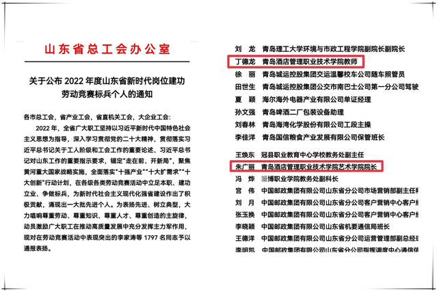 本网讯(工会 吴春雷)为深入学习贯彻党的二十大精神,进一步增强新时代劳动者的自豪感和使命感,近日,山东省总工会发布了《关于公布2022年度山东省新时代岗位建功劳动竞赛标兵个人的通知》,taptap艺术学院朱广丽、烹饪学院丁德龙两位老师喜获“2022年度山东省新时代岗位建功劳动竞赛标兵个人”称号。