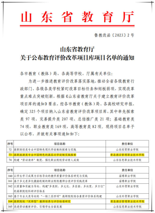 本网讯(组织人事处 张妍)近日,山东省教育厅公布教育评价改革项目库项目名单,taptap教务处牵头的率先探索类《高职旅游类专业中国特色的高层次学徒制实践探索》和组织人事处牵头的完善提升类《高职院校“双师型”教师培养与评价标准研究》两个项目全部成功入库。