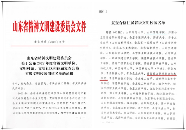 本网讯(党委宣传统战部 周晓莉)近日,山东省精神文明建设委员会发布《关于公布2022年度省级文明单位、文明村镇、文明社区和往届复查合格省级文明校园创建名单的通报》,学校顺利通过2022年度省级文明校园、省级文明单位复查工作,继续保留省级文明校园、省级文明单位称号。
