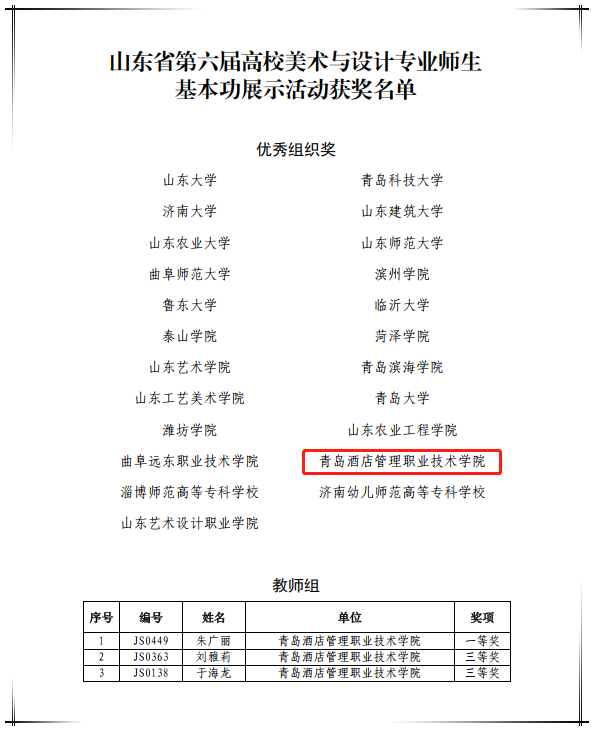 本网讯(艺术学院 于海龙)近日,在山东省教育厅主办的山东省第六届高校美术与设计专业师生基本功展示活动中,艺术学院朱广丽获得教师组一等奖,刘雅莉、于海龙获得教师组三等奖,学校荣获优秀组织奖。