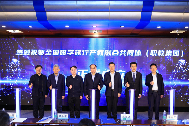 在热烈的掌声中,王昆欣、蔡全记、青岛市教育局总督学李晓元、安顺职业技术学院校长李昕昌、平顶山职业技术学院校长丁笑生、学校党委书记李达、校长姜玉鹏共同为全国研学旅行产教融合共同体启幕。
