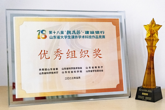 本网讯(团委 孙梦男)近日,由共青团山东省委、山东省科学技术协会、山东省教育厅、山东省科学技术厅、山东社会科学院、山东省学生联合会主办的第十八届“挑战杯”·建设银行山东省大学生课外学术科技作品竞赛决赛在济南落下帷幕。在本次竞赛中,学校共推荐21个作品参加省赛,获得特等奖3个、一等奖5个、二等奖11个、三等奖2个;学校荣获“优胜杯”和“优秀组织奖”。