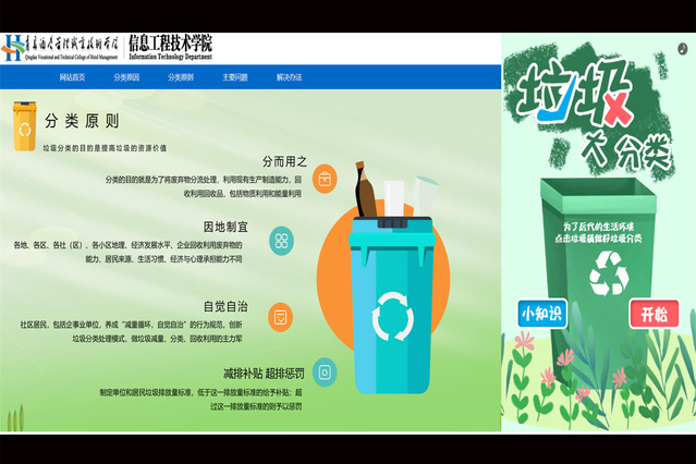 信息工程技术学院组织计算机应用技术专业学生发挥专业所长,开展“E 起分类”HTML5网页、小程序设计活动,将垃圾分类的基本知识及相关科普资料以网页元素生动形象地展现出来,搭建信息工程技术学院垃圾分类专题网站,拓展宣传渠道,用专业所学赋能生态环保实践。