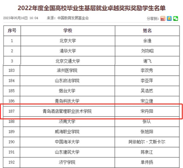 本网讯(招生就业办公室 工商管理学院)近日,教育部、中国教育发展基金会公布了2022年度全国高校毕业生基层就业卓越奖拟奖励学生名单,经高校推荐、专家评审,taptap2017届市场营销专业毕业生宋丹阳荣获全国高校毕业生基层就业卓越奖。