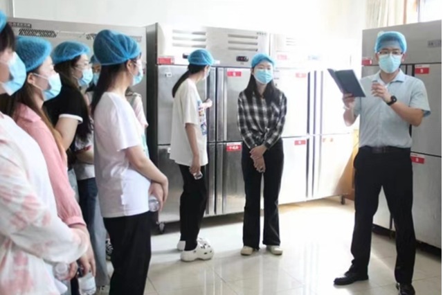 后厨参观环节,各餐厅经理员从保障食品安全的角度,对食堂原料采购、食品贮存、生产加工、食品留样、清洗消毒、餐厨废弃物处置、员工管理等方面进行详细介绍,带领同学们参观了仓库、洗菜间、切配间、操作间、留样间、售卖间,并以问答的形式解答了同学们在学校日常生活中的疑惑。