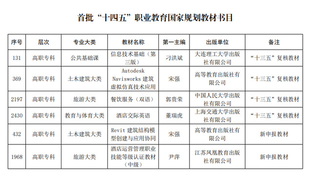 “十四五”职业教育国家规划教材遴选工作是教育部为贯彻落实2021年全国职业教育大会和全国教材工作会议精神而启动的一项教材建设工作。“十四五”期间,国家将分批建设1万种左右职业教育国家规划教材,以规划教材为引领,高起点、高标准建设中国特色高质量职业教育教材体系。此次,经有关单位申报、形式审查、专家评审、专项审核、专家复核、面向社会公示等程序,共确定7251种教材入选首批“十四五”职业教育国家规划教材,涵盖全部19个专业大类、1382个专业。