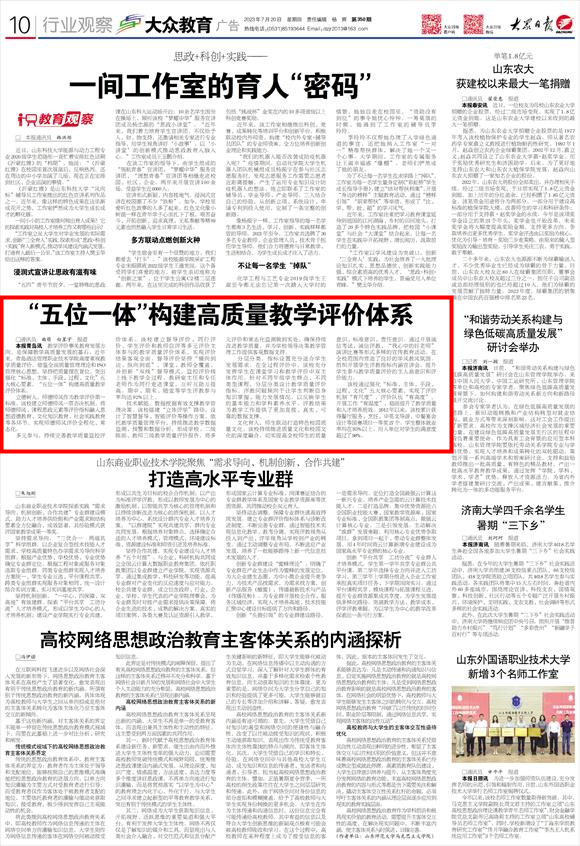 本报青岛讯 教学评价事关教育发展方向,是保障教学高质量发展的基石。近年来,taptap点点官方网站高度重视教学质量评价,借鉴全面质量管理理论和ISO管理核心思想,坚持把质量摆在首位,突出强化“标准、主体、手段、过程、文化”五大核心要素,“五位一体”构建高质量教学评价体系。