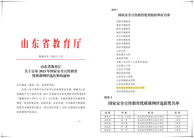 本网讯(学生工作处)8月2日,由山东省教育厅主办的2023年国家安全宣传教育优质课例评选结束,taptap荣获一等奖1项、二等奖2项、三等奖2项,学校获优秀组织奖。