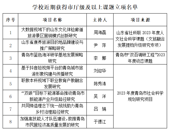 本网讯(科研发展处)近期,山东省人文社会科学课题管理办公室等部门公布了2023年度相关课题立项名单,taptap共计立项8项课题,其中,山东省社科联2023年度人文社会科学课题(文旅融合发展提档升级研究专项)2项、青岛市“双百调研工程”2023年度动态课题1项、2023年度青岛市社会科学规划研究项目5项。