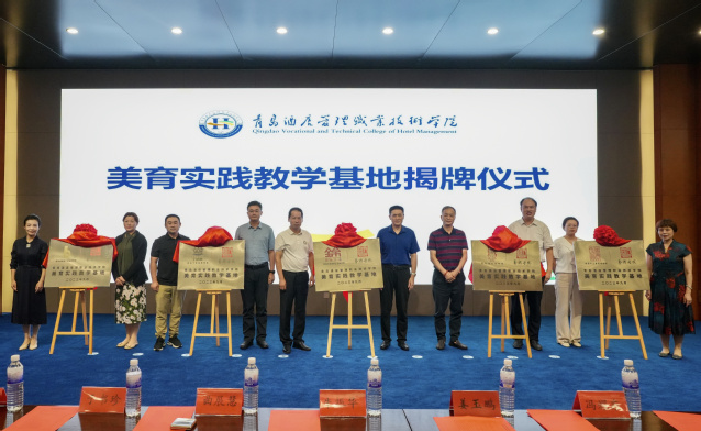 本网讯(艺术学院 袁宏强)9月19日下午,学校在学术报告厅举行美育实践教学基地揭牌仪式,青岛市文联主席王绍波、山东省民俗学会常务理事朱振华、青岛市文化和旅游局非遗处处长冯耀东、学校校长姜玉鹏参加活动。