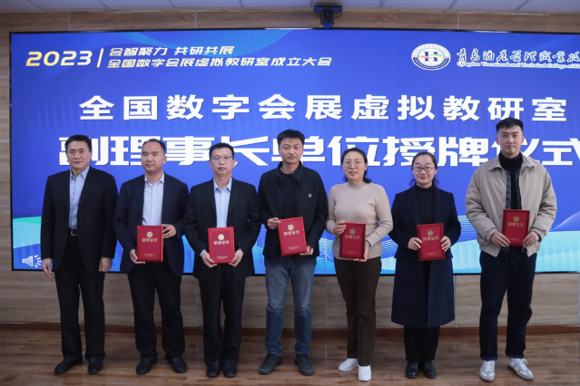 活动中,姜玉鹏、宫艺萌共同为全国数字会展虚拟教研室揭牌。姜玉鹏为中国海洋大学、上海旅游高等专科学校等17家副理事长单位授牌。