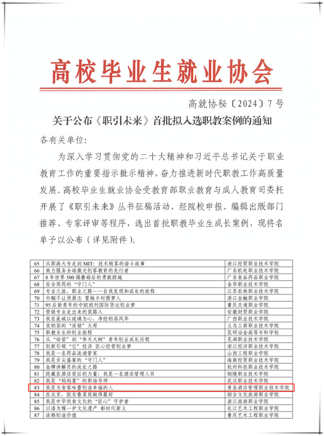 为深入学习贯彻党的二十大精神和习近平总书记关于职业教育工作的重要指示批示精神,奋力推进新时代职教工作高质量发展,受教育部职业教育与成人教育司委托,高校毕业生就业协会组织开展了《职引未来》丛书征稿活动,遴选出一批优秀案例汇编成书。经院校申报、编辑出版部门推荐、专家评审等程序,最终从全国近1000个案例中评选出100个职教毕业生成长案例,作为优秀典型进行推广宣传。前期,学校认真组织、严格筛选,进行反复修改打磨,推荐案例成功入选。