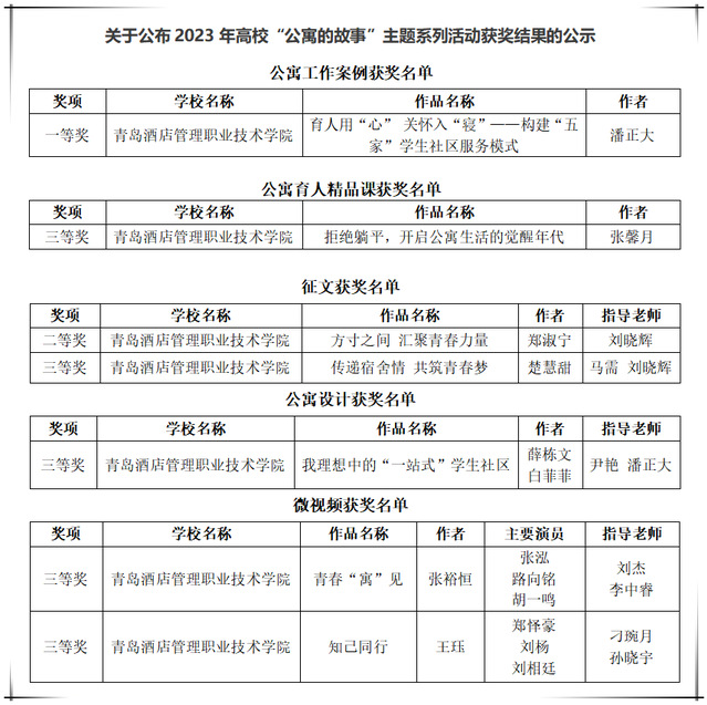 本网讯(学生工作处)近日,山东省教育厅公布了2023年高校“公寓的故事”主题系列活动的评选结果,学校在各项比赛中成绩优异,共获得一等奖1项、二等奖1项、三等奖5项。