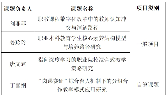 此次立项的四项课题横跨职业教育、课程数字化改革、核心素养培养以及教学模式创新等多个前沿领域,深入探讨了职教课程数字化改革中的教师认知冲突消解、职业本科教育学生的核心素养培养、职业院校混合式教学策略促进深度学习,以及“岗课赛证”机制下的分组合作教学模式在信息技术类专业中的应用。上述研究旨在提供坚实的理论支撑与实用的实践指导,进一步优化教学模式,全面提升taptap教育教学质量和学生就业竞争力。