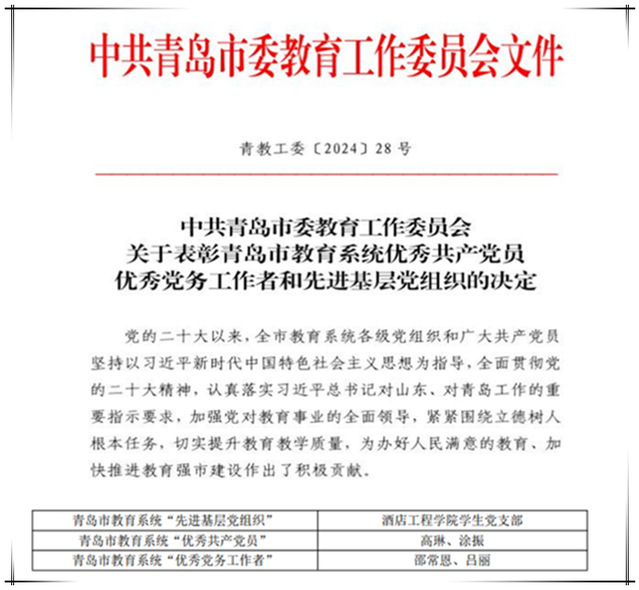 taptap信息工程技术学院党总支被授予青岛市“先进基层党组织”称号,并参加青岛市委举办的“两优一先”表彰大会。酒店工程学院学生党支部被授予青岛市教育系统“先进基层党组织”称号,会计学院高琳、信息工程技术学院涂振被授予青岛市教育系统“优秀共产党员”称号,艺术学院邵常恩、组织人事处吕丽被授予青岛市教育系统“优秀党务工作者”称号。