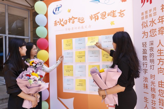 一个镜头、一个场景、一句祝福……教师节期间,校园内处处洋溢着尊师重教的良好风尚。图书馆楼前悬挂的横幅、电子显示屏上滚动播放的祝福语……让弘扬尊师的风尚入心见行;教室里、微信上,一句句“老师,节日快乐!”让老师们感受到了浓浓的关怀与尊重。在会计学院,一面装饰着玫瑰与向日葵的鲜花主题墙成为了焦点,玫瑰象征着老师们的热情与智慧,向日葵则寓意着老师们始终向着光明与希望前行,主题墙寄托了学生们对老师的深深敬意。在信息工程技术学院,“秋日拾趣 师恩难忘——写给老师的散文诗”传递着感念师恩的美好情怀。艺术学院学子诗朗诵《烛光里的颂歌》,用最动人的语言和最饱满的情感,献上一份专属“告白”,诉说着对老师的感恩之情。学生们通过多元形式为亲爱的老师送上深深的敬意和节日的祝福,并将感恩的心化作行动的力量,在奋斗中追逐青春梦想。