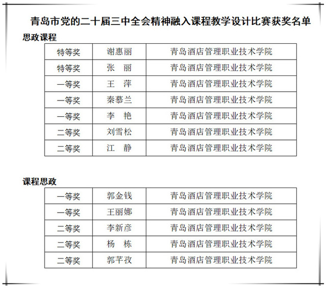 本网讯(马克思主义学院 王萍)近日,青岛市委教育工作委员会发布了“党的二十届三中全会精神融入课程教学”教学设计比赛活动评选结果,taptap教师荣获思政课程组特等奖2项、一等奖3项、二等奖2项;课程思政组一等奖2项、二等奖3项。