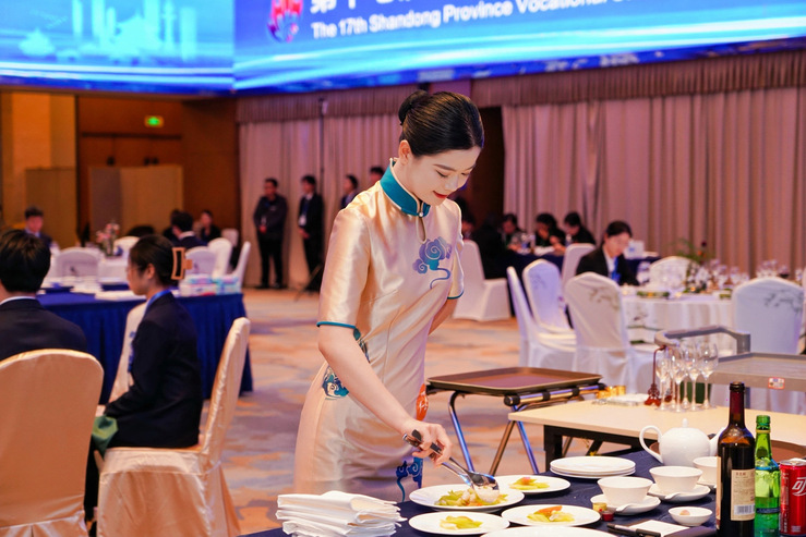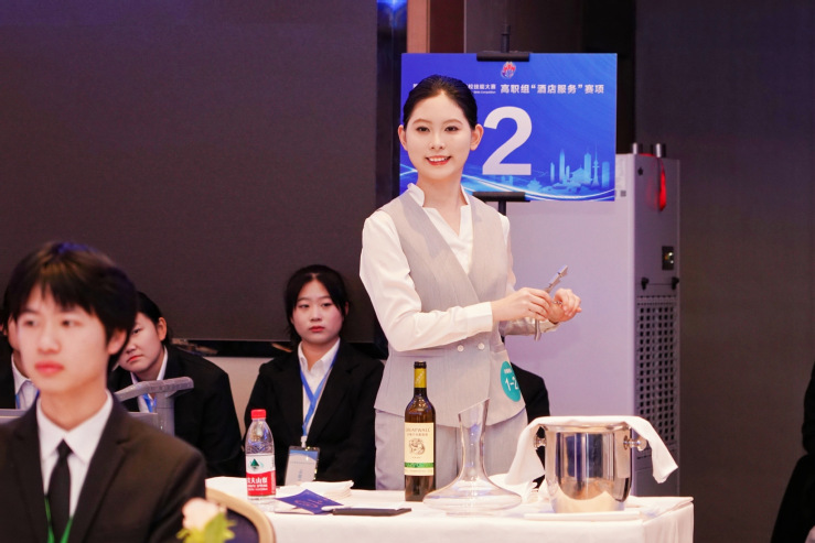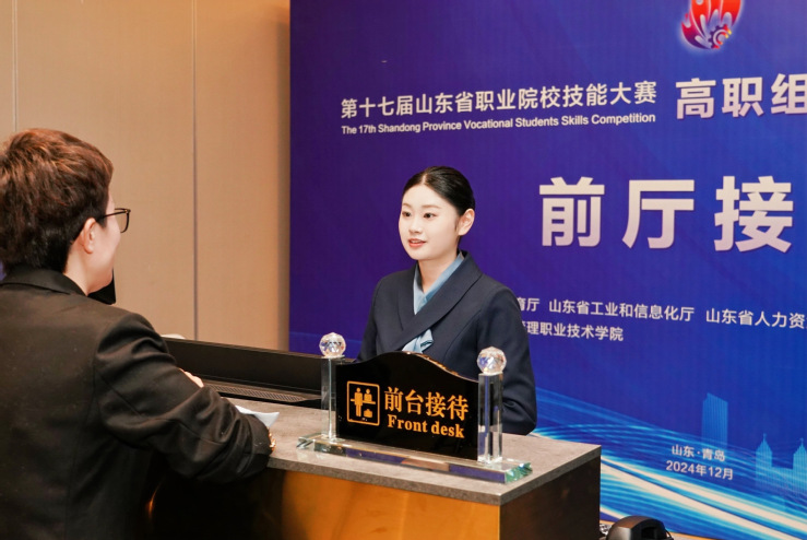 本次比赛由山东省教育厅、山东省工业和信息化厅、山东省人力资源和社会保障厅、山东省农业农村厅等四部门主办,共有来自全省高职院校34个参赛队的102名参赛选手参加。本届大赛着眼于考核学生在酒店接待、宴会设计、中西餐服务等工作中的综合素质和能力,分为前厅接待、中餐服务和西餐服务三个模块。其中,前厅接待模块为办理入住、退房离店两项内容,西餐服务模块为休闲餐厅服务内容,两个模块全程使用英语服务,整个比赛内容对标世赛和行业规范,注重提升学生职业素养,考核内容项目多、难度大,专业性要求高。