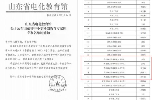 本网讯(教育信息中心 江珊)3月12日,山东省电化教育馆发布了《关于公布山东省中小学科创教育专家库专家名单的通知》(鲁教馆函〔2025〕14号),taptap朱广丽、衣文娟、李显、彭霞、战肖飞5位教师入选。