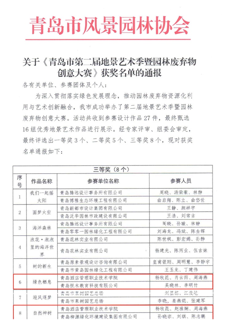 本次大赛由青岛市园林和林业局主办,青岛市市级公园管理服务中心、青岛市风景园林协会、青岛城发集团物管公司承办,以“生态环保”“循环利用”“变废为宝”为理念。活动共收到参赛设计作品27件,经过专家评审和组委会严格遴选,最终评选出一等奖3个、二等奖5个、三等奖8个。