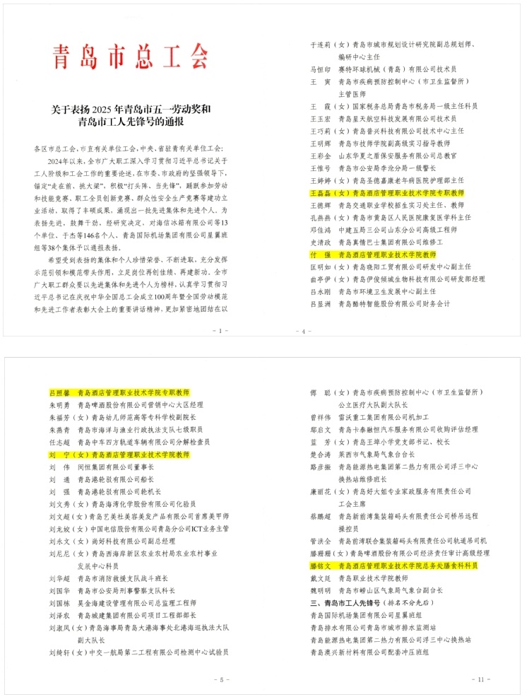 本网讯(工会 吴春雷)近日,青岛市总工会发布了《关于表扬2025年青岛市五一劳动奖和青岛市工人先锋号的通报》,表彰了一批表现突出的先进集体和先进个人。taptap教师王磊磊、付强、吕照馨、刘宁、滕铭文5位教师荣获“青岛市五一劳动奖章”。