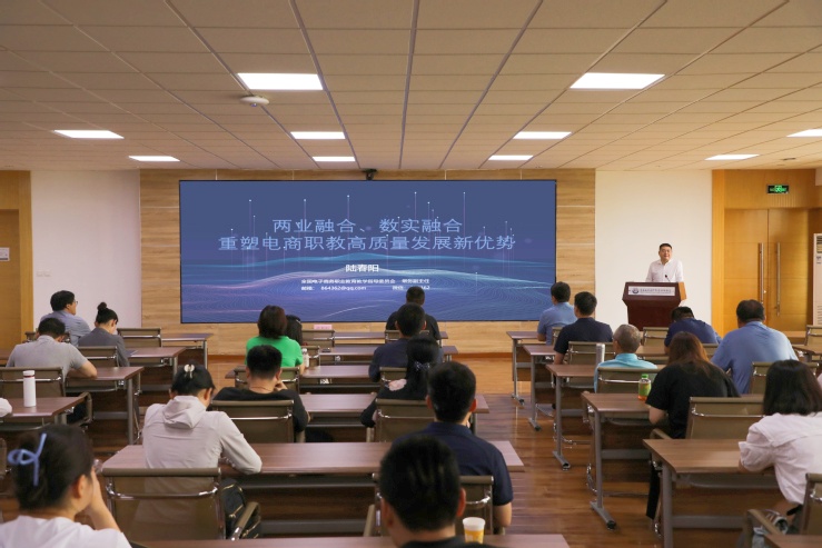 期间,陆春阳作了题为《两业融合 数实融合 重塑电商职教高质量发展新优势》的学术报告。他表示,面对新一轮专业结构调整和专业内涵升级,电子商务类专业需要锚定立德树人根本,立足“数实融合”“两业融合”,将专业建构逻辑从基于在线零售的“人、货、场”发展为基于流通价值链的“产、供、消”,通过课程创新带动教师发展,实现专业渐进式系统性改革,重塑电商职业教育高质量发展新优势。