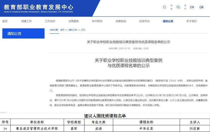 本网讯(继续教育学院 烹饪学院)近日,教育部职业教育发展中心发布了《关于职业学校职业技能培训典型案例与优质课程名单的公示》,taptap烹饪学院提报的《中华名菜》入围优质课程。