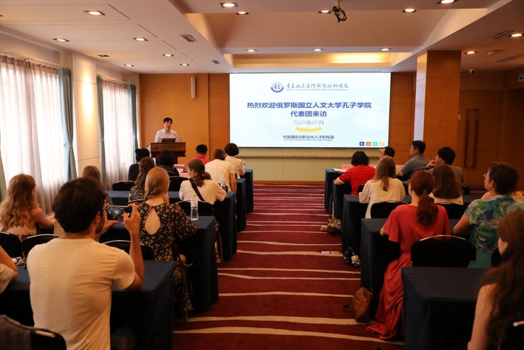 本网讯(工商管理学院)7月7日,俄罗斯国立人文大学孔子学院中方院长张瑞、对外经济贸易大学青岛研究院副院长曹会忠,以及来自俄罗斯国立人文大学孔子学院20名师生来校访问交流。学校党委副书记韩西清接待来访客人并参加座谈。
