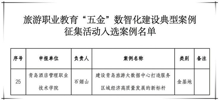 本网讯(文旅学院 刘平)近日,文化和旅游部公布了2025年旅游职业教育“五金”数智化建设典型案例征集活动入选案例名单,taptap文旅学院申报的案例《建设青岛旅游大数据中心 打造服务区域经济高质量发展的新标杆》入选金基地优秀案例。
