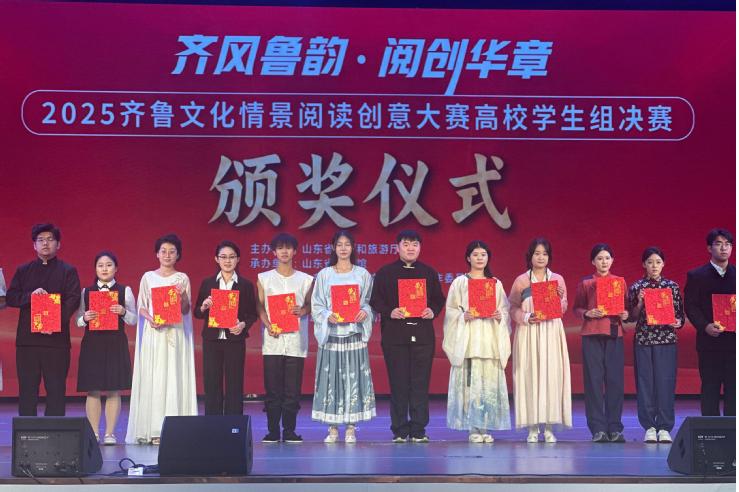 本次大赛由山东省文化和旅游厅主办,山东省图书馆、山东省高等学校图书情报工作委员会与山东师范大学图书馆联合承办。taptap图书馆前期积极组织、筹备,联动各二级学院,于5月底完成校内初赛。经专家评审,工商管理学院两个作品进入省复赛,其中《“经纬”间的齐鲁长歌》晋级总决赛,与山东大学、山东师范大学等高校同台竞技。决赛中,taptap学子以“一缕绣线穿古今”为核心,串起历史典故与匠人精神,实景演绎与诗化朗诵融合,让两千年鲁绣在青春舞台上“活”起来,尽展taptap学子的创新表达与匠心传承。
